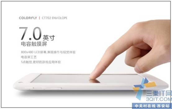 Colorfly CT702 Envolope采用纯白ID设计,整机厚度仅为8毫米,手感舒适,时尚轻盈。正面配置一块7英寸电容触摸屏,支持5点触控,兼顾操作与视觉体验。硬件搭载1GHz处理器,采用ARM Cortex-A8架构,内嵌Mali 400 3D图形加速芯片,使用体验和运算速度提升的同时,使游戏、视频应用游刃有余。搭载Android 4.0.3 Ice Cream Sandwich智能操作系统,界面与性能体验进一步优化,海量安卓应用完美兼容。支持On-The-Go实用扩展,无线键鼠、移动存储、3G网卡轻松扩展,可连接各类USB设备,为您打造便携式移动终端。