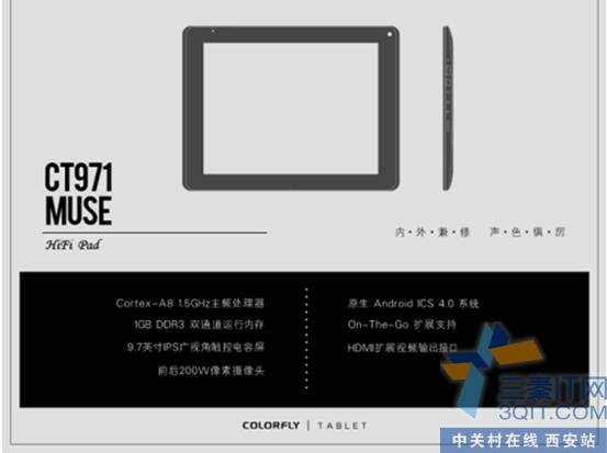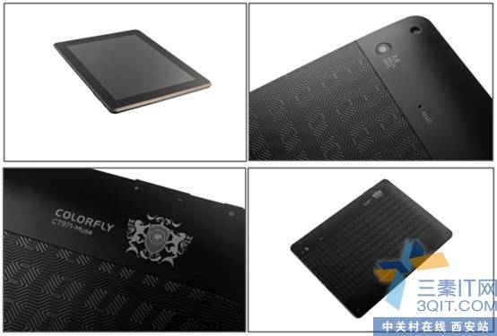 Colorfly CT971 Muse采用的9.7英寸机身设计,主体配色为黑色,但在机身边缘处围上了深咖啡色的边框,略倾斜的角度非常适合人们把持时大拇指放置。硬件配置方面采用的单核Cortex-A8核心的全志A10芯片,CPU理论最大主频可达到1.5GHz,搭载单核Mali400 Gpu与DDR3 RAM内存。