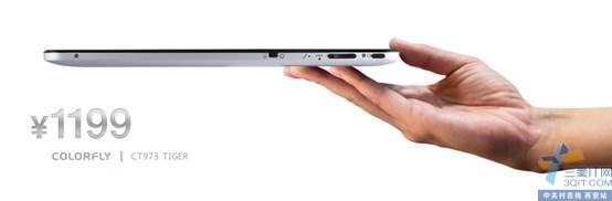 七彩虹旗下平板电脑品牌Colorfly超高性价比双核游戏平板Colorfly CT973 Tiger。该机配备NV Tegra2双核处理器,有用9.7英寸分辨率1024×768多点触控IPS屏幕,支持HDMI高清显示输出及On-The-Go扩展功能。目前,经销商报价1199元。