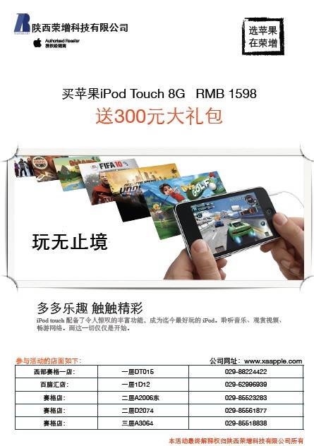 苹果iPod touch第三代,该机支持无线上网、音乐、视频播放等多种功能,是一款娱乐性很强的随身装备,也是当下最具时尚性的播放器产品。今天笔者从经销商“荣增科技”(荣增科技是苹果产品核心代理商)了解到该机8GB版本的最近市场售价仅为1598元。此款机器的促销信息:凡购买苹果Ipod Touch(8G)就送300大礼包 (活动日期是:7月1日到7月15日)。感兴趣的朋友不妨抓紧时间联系经销商。